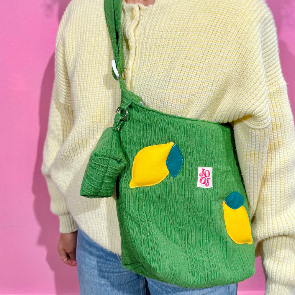 Chaque sac est unique : les coupons de tissu proviennent de seconde main (nappes, draps, rideaux, vêtements…) et la doublure est réalisée dans d’anciens linges de maison. L’étiquette est upcyclée, tamponnée sur du tissu coton, et il est rembourré pour un effet bien dodu, ainsi que les citrons pour leur donner du volume!