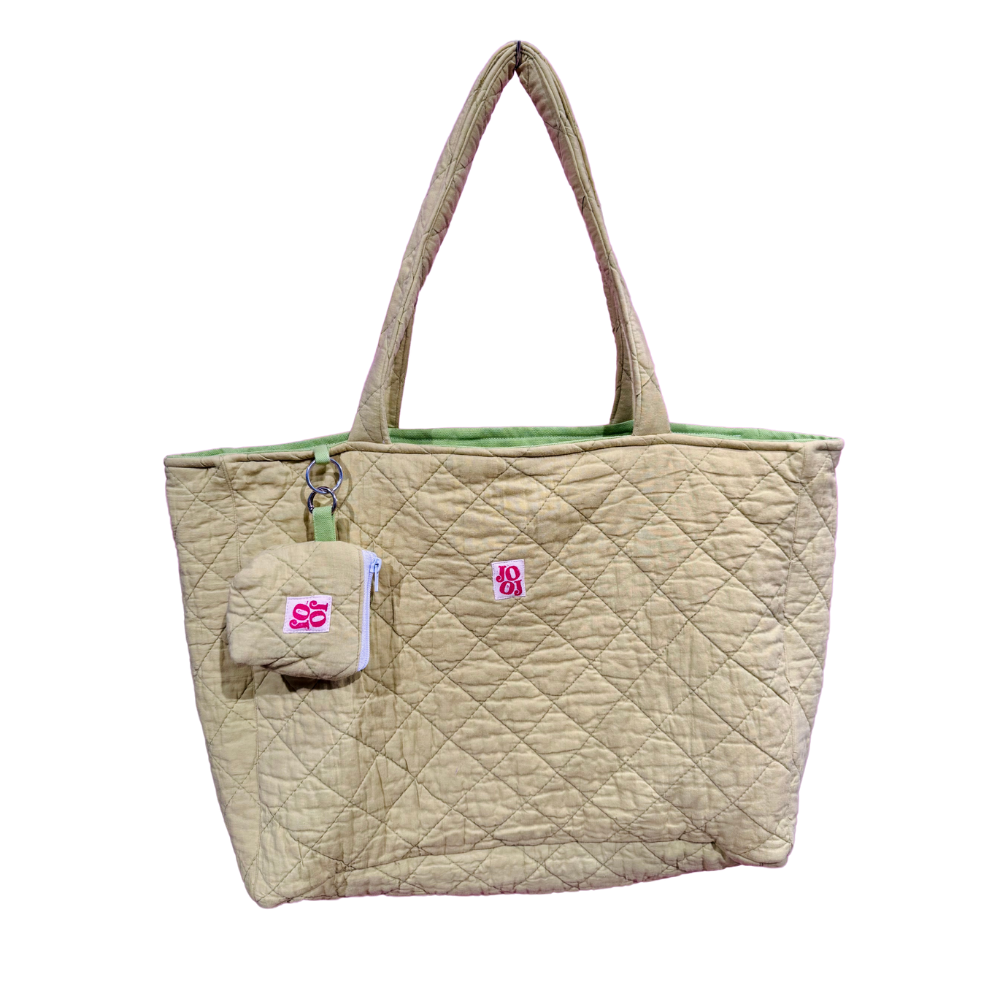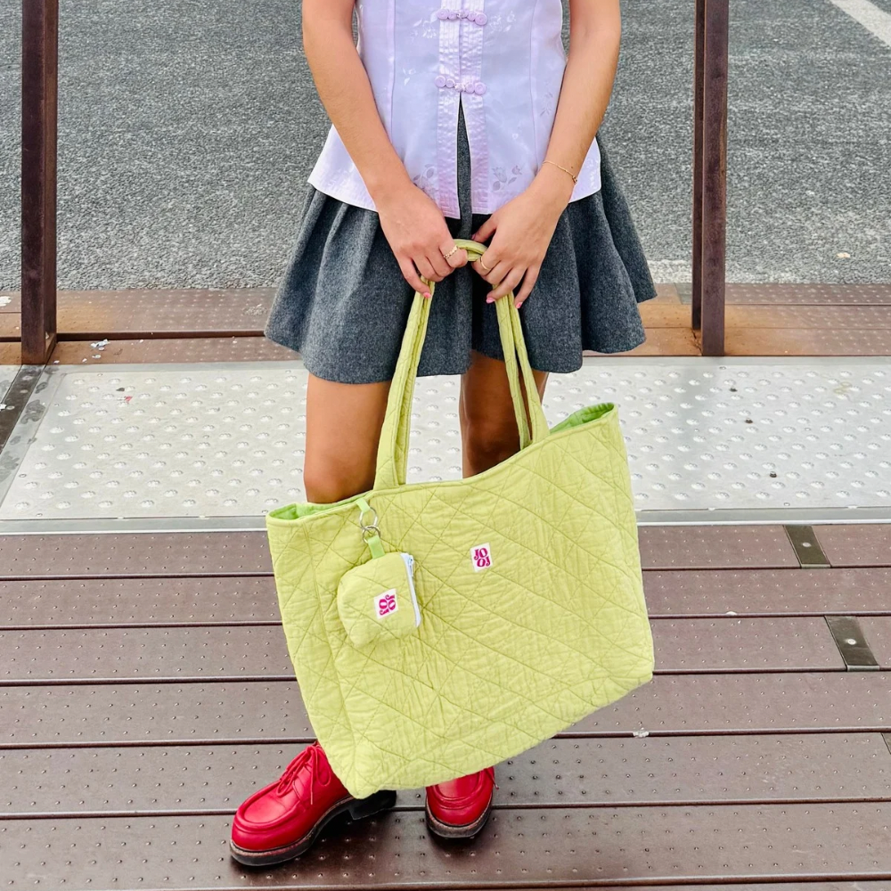 Coupé dans un couvre-lit, ce sac est pensé comme une alternative au cabas ou tote bag. Il se porte à l’épaule, se ferme par zip et dispose d’une grande poche arrière zippée. Une petite pochass zipée, accrochée à une boucle en métal, est parfaite pour tes clés, AirPods… ou même ton Tamagotchi !