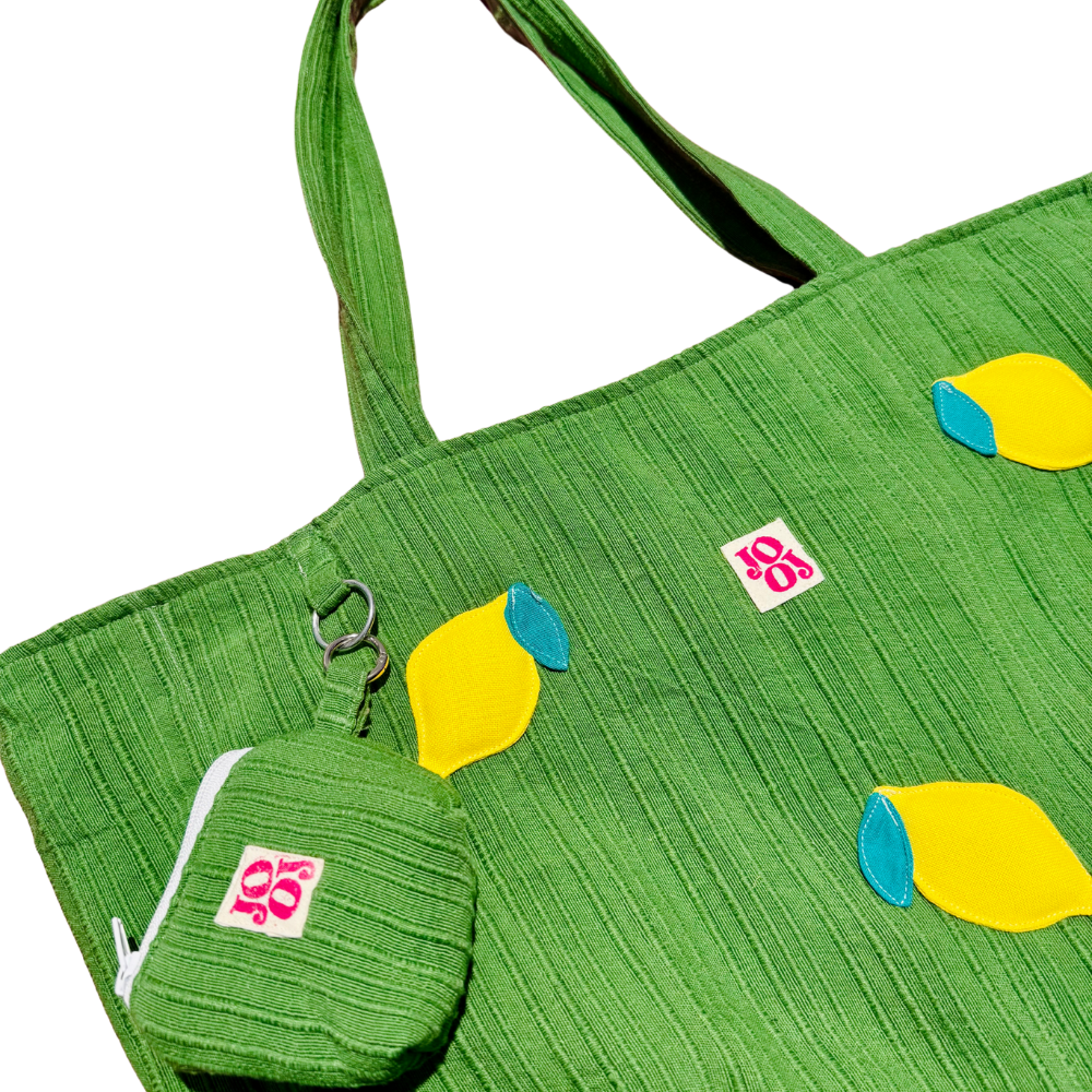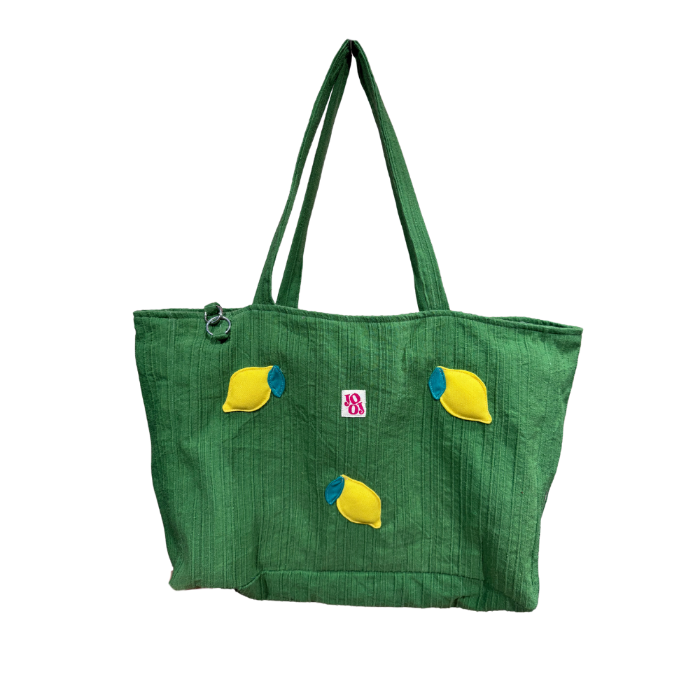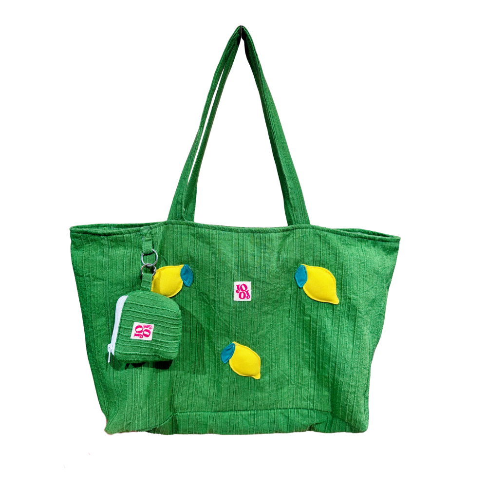 Coupé dans une couverture verte et un rideau jaune, ce sac est pensé comme une alternative au cabas ou tote bag. Les motifs citrons sont rembourrés pour un effet bien dodu. Il se porte à l’épaule, se ferme par zip et dispose d’une grande poche arrière zippée. Une petite pochass zipée, accrochée à une boucle en métal, est parfaite pour tes clés, AirPods… ou même ton Tamagotchi !
