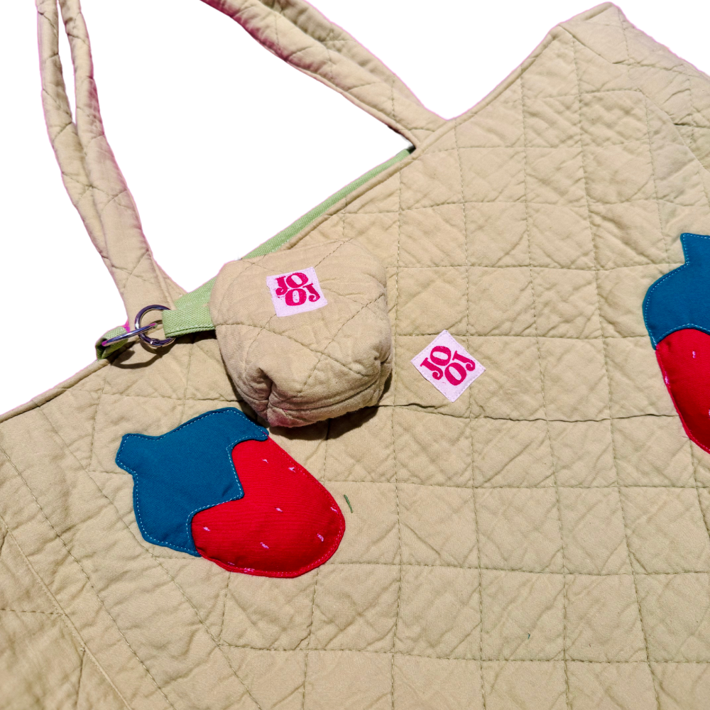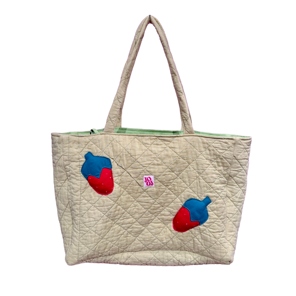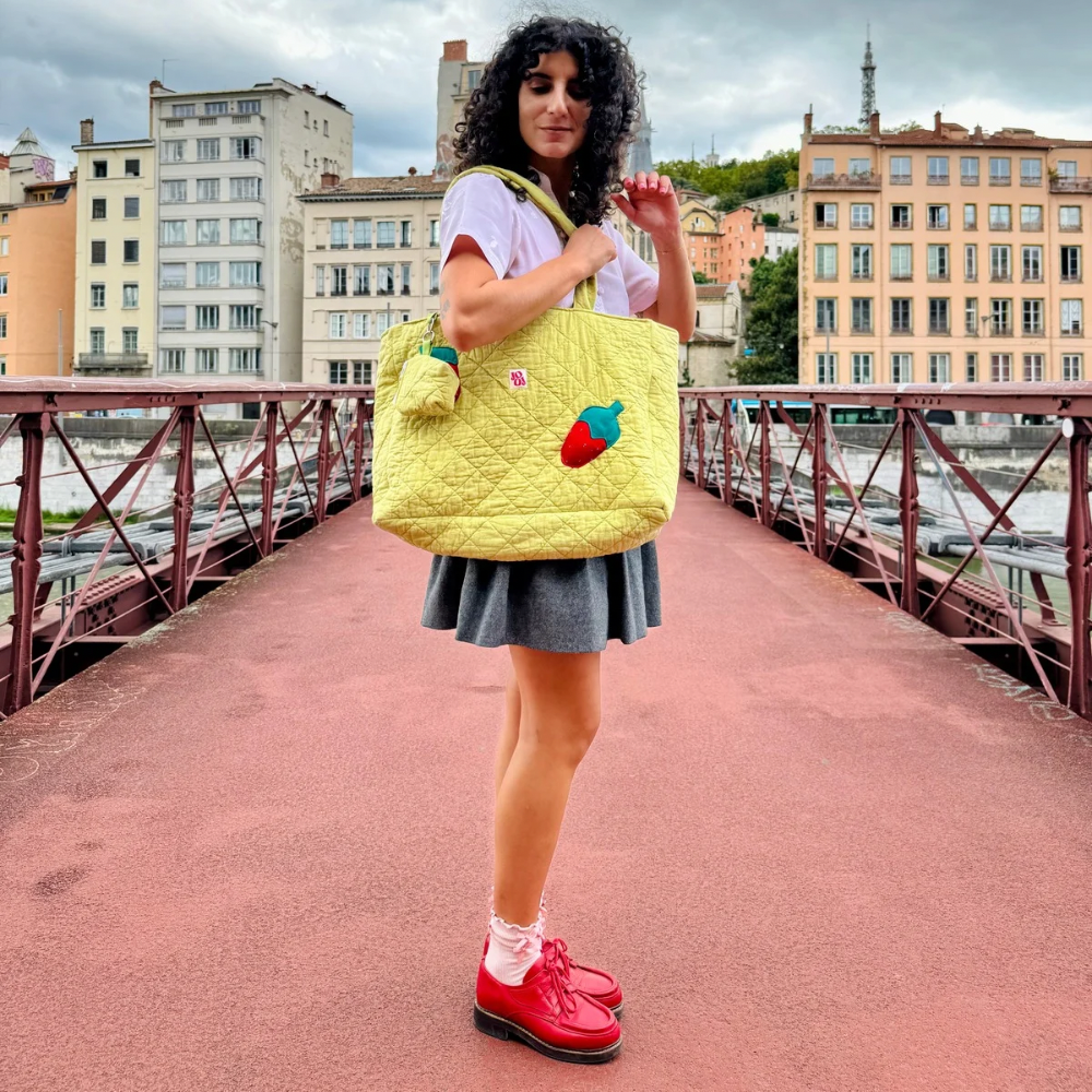 Coupé dans un couvre-lit en boutis et un drap rouge, ce sac est pensé comme une alternative au cabas ou tote bag. Les motifs fraises sont rembourrés pour un effet bien dodu. Il se porte à l’épaule, se ferme par zip et dispose d’une grande poche arrière zippée. Une petite pochass zippée, accrochée à une boucle en métal, est parfaite pour tes clés, AirPods… ou même ton Tamagotchi !