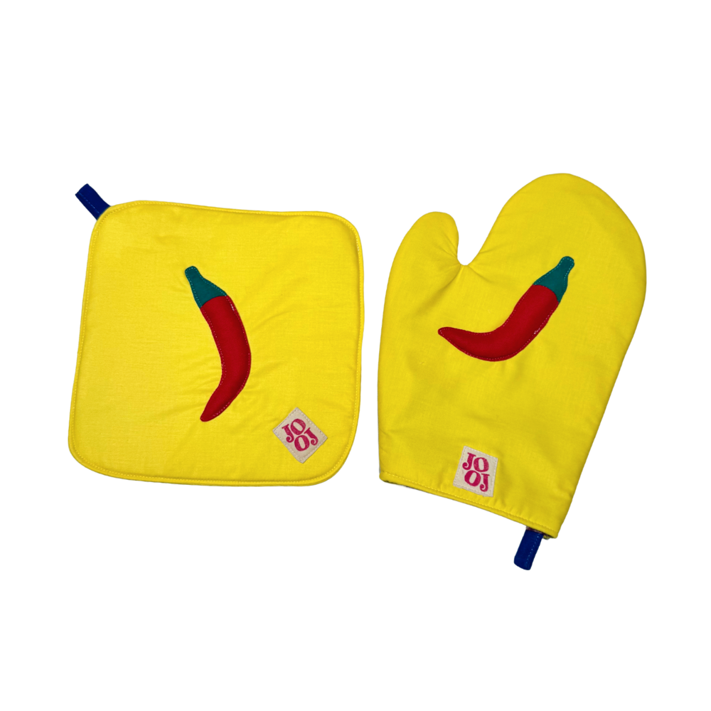 Chaque pièce est upcyclée : tissus de seconde main et étiquette tamponnée à l’encre textile durable. Gant et manique sont doublés de thermolam pour protéger tes mains et tes surfaces de la chaleur. La couleur peut légèrement s’assombrir avec le temps, pour un charme encore plus vintage.