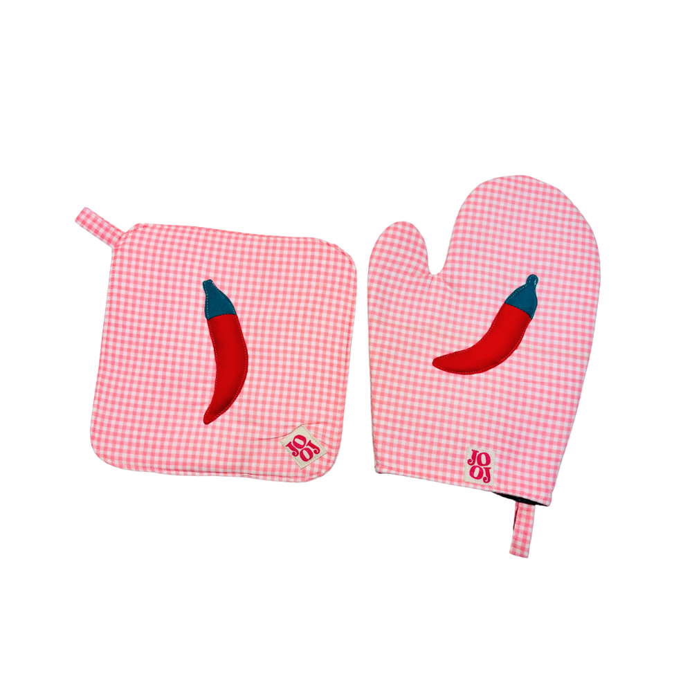 Chaque pièce est upcyclée : tissus de seconde main et étiquette tamponnée à l’encre textile durable. Gant et manique sont doublés de thermolam pour protéger tes mains et tes surfaces de la chaleur. La couleur peut légèrement s’assombrir avec le temps, pour un charme encore plus vintage.