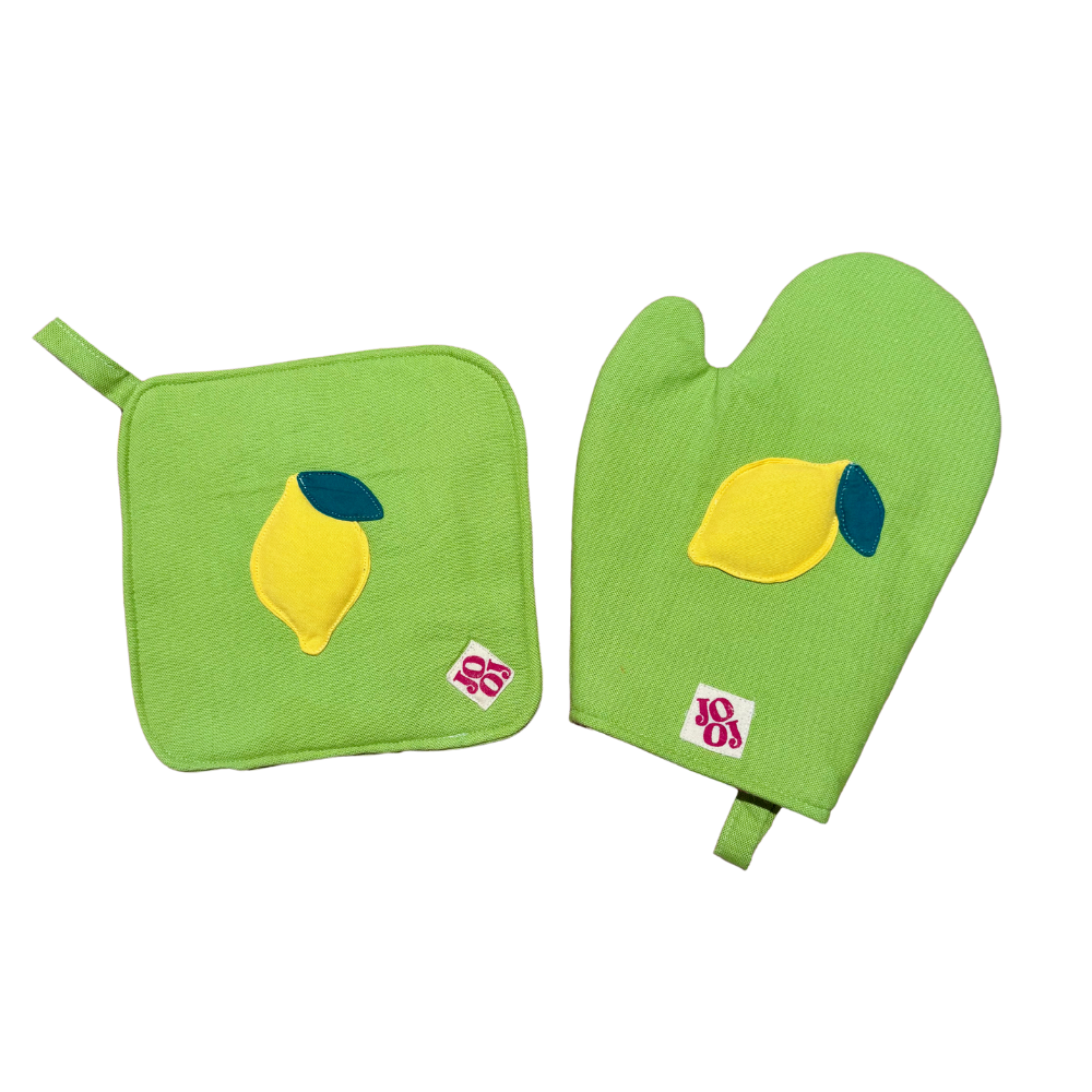 Chaque pièce est upcyclée : tissus de seconde main et étiquette tamponnée à l’encre textile durable. Gant et manique sont doublés de thermolam pour protéger tes mains et tes surfaces de la chaleur. La couleur peut légèrement s’assombrir avec le temps, pour un charme encore plus vintage.