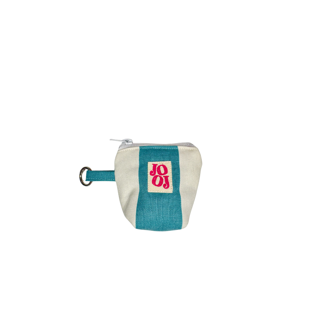 Coupée dans des tissus de seconde main, cette mini trousse avec mousqueton est bien dodue grâce à son rembourrage. L’étiquette est tamponnée sur tissu coton pour un détail artisanal.