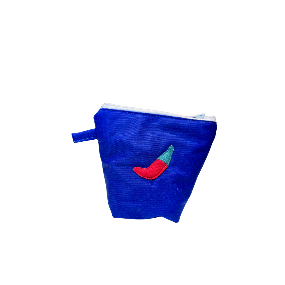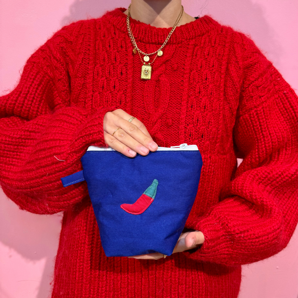 Coupée dans des tissus de seconde main, cette trousse est bien dodue grâce à son rembourrage. L’étiquette est tamponnée sur tissu coton pour un petit détail artisanal.