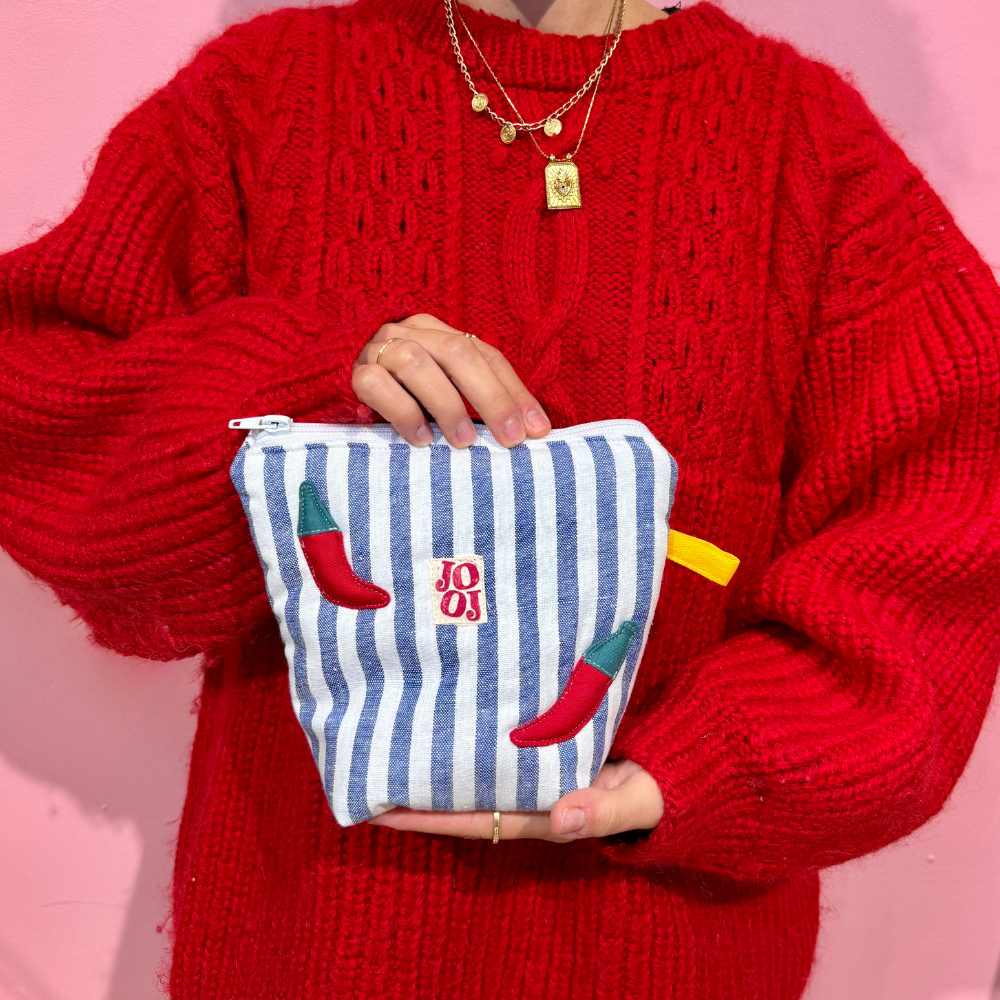 Coupée dans des tissus de seconde main, cette trousse est bien dodue grâce à son rembourrage. L’étiquette est tamponnée sur tissu coton pour un petit détail artisanal.