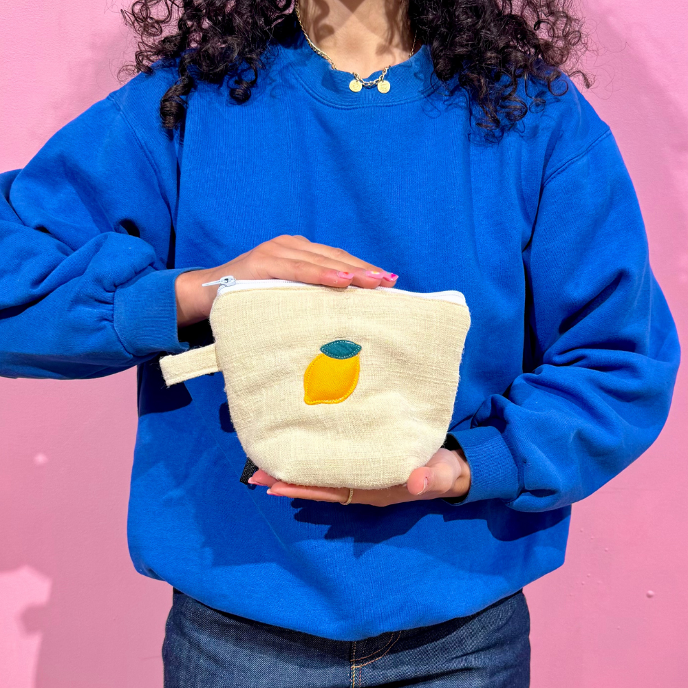 Coupée dans des tissus de seconde main, cette trousse est bien dodue grâce à son rembourrage. L’étiquette est tamponnée sur tissu coton pour un petit détail artisanal.