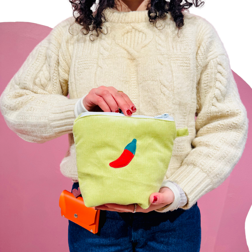 Pochass en velours côtelé vert à motif piment