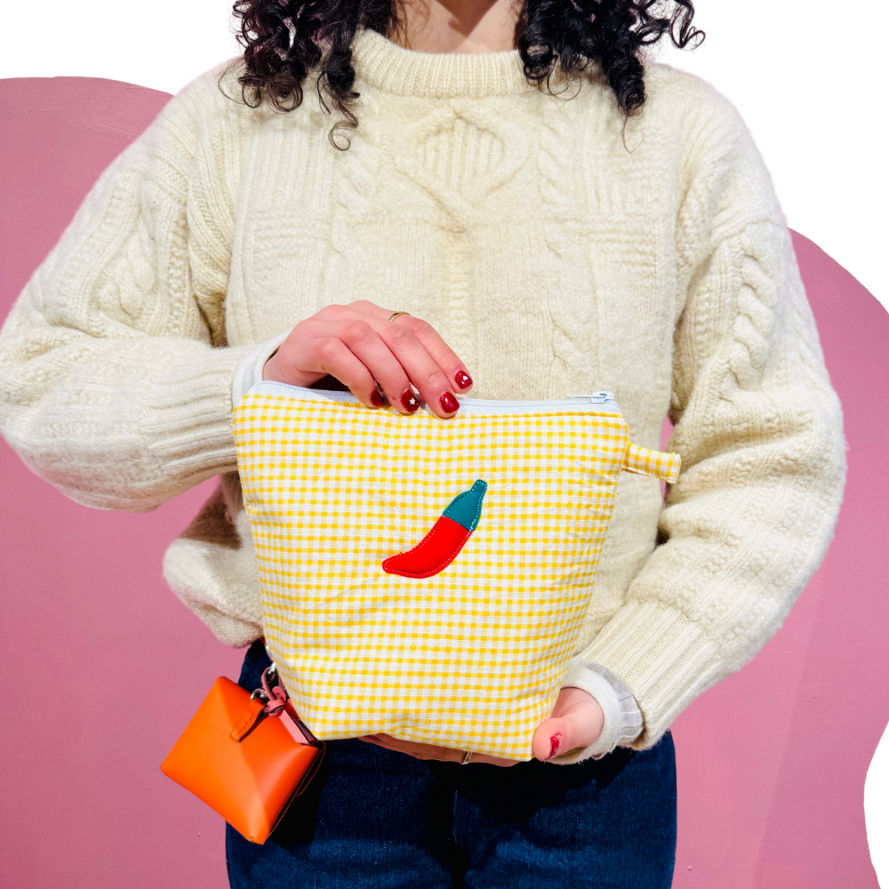 Coupée dans des tissus de seconde main, cette trousse est bien dodue grâce à son rembourrage. L’étiquette est tamponnée sur tissu coton pour un petit détail artisanal.