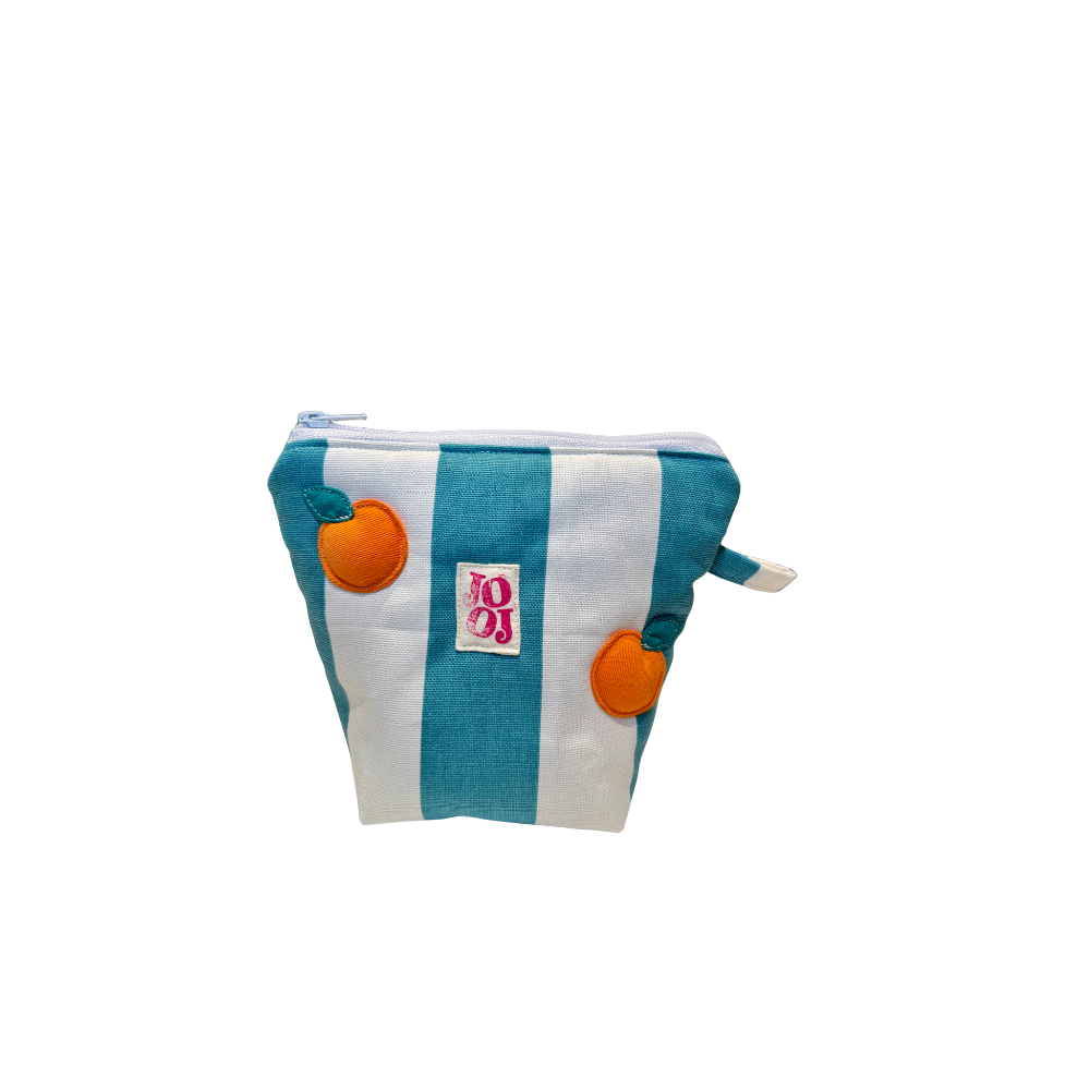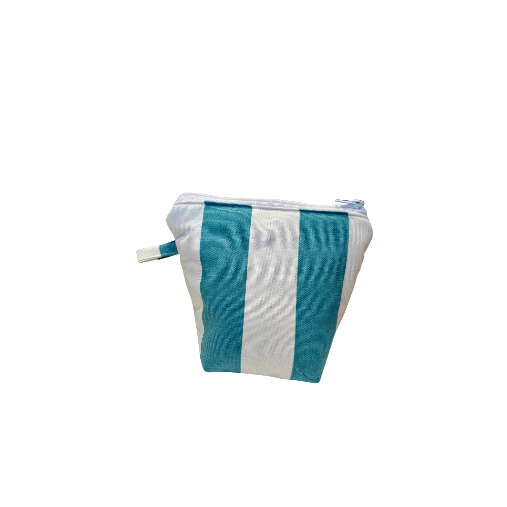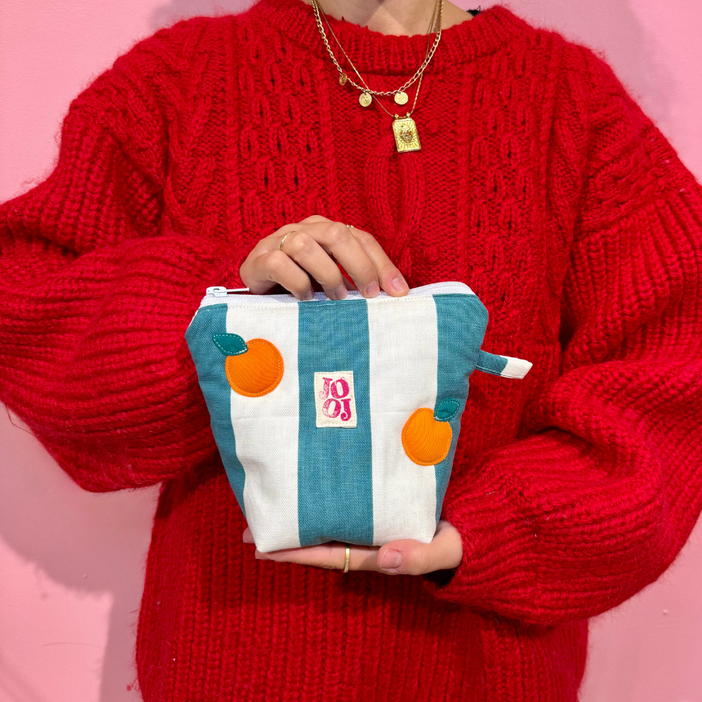 Coupée dans des tissus de seconde main, cette trousse est bien dodue grâce à son rembourrage. L’étiquette est tamponnée sur tissu coton pour un petit détail artisanal.